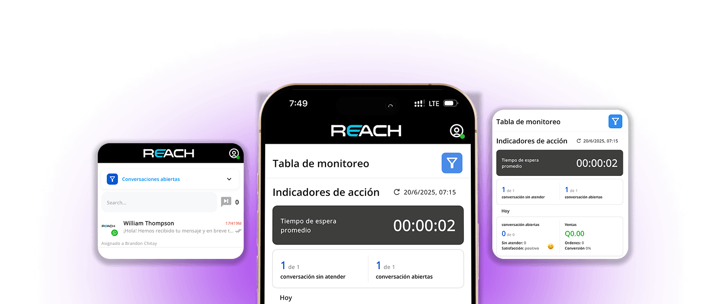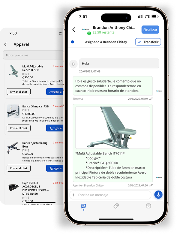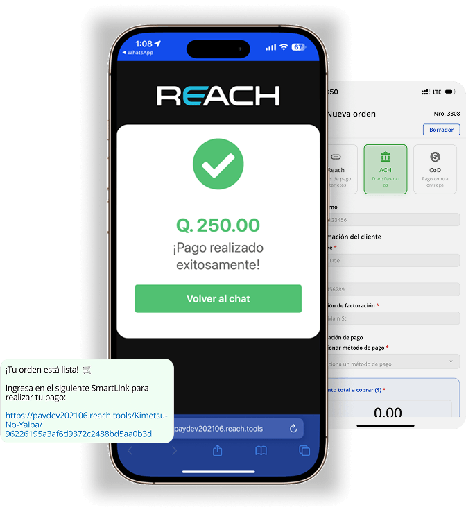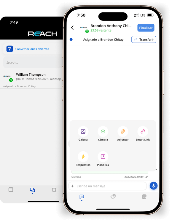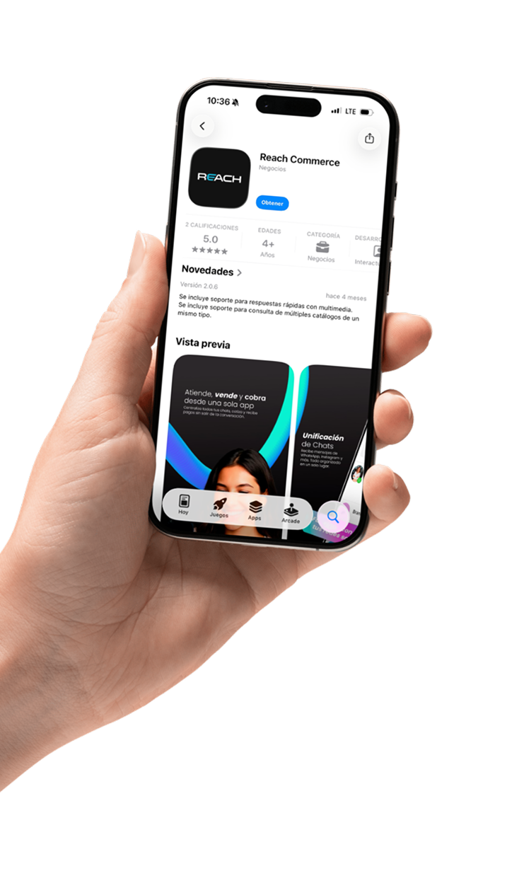 La app móvil de Reach es una aplicación para iPhone y Android que permite a negocios en Latinoamérica a atender clientes por WhatsApp, Instagram y Facebook, compartir productos, generar cobros y gestionar equipos de ventas desde el celular. Es la versión móvil de Reach.tools, la plataforma de comercio conversacional para Latinoamérica.