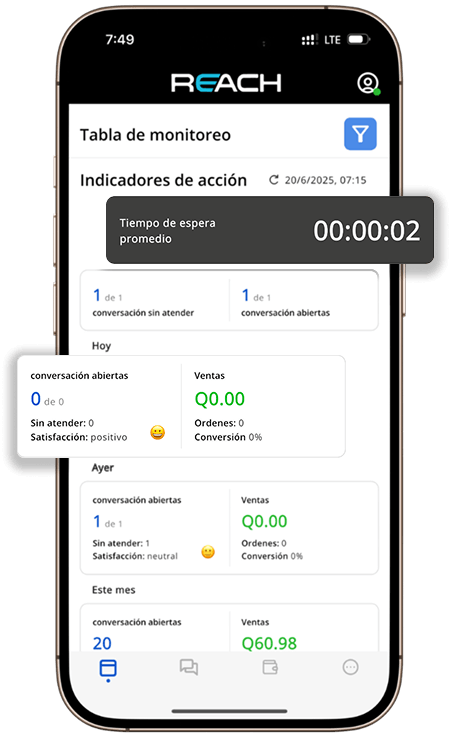 Monitorea en tiempo real qué conversaciones están activas, quién las está atendiendo y cuánto tarda cada respuesta, estés donde estés.